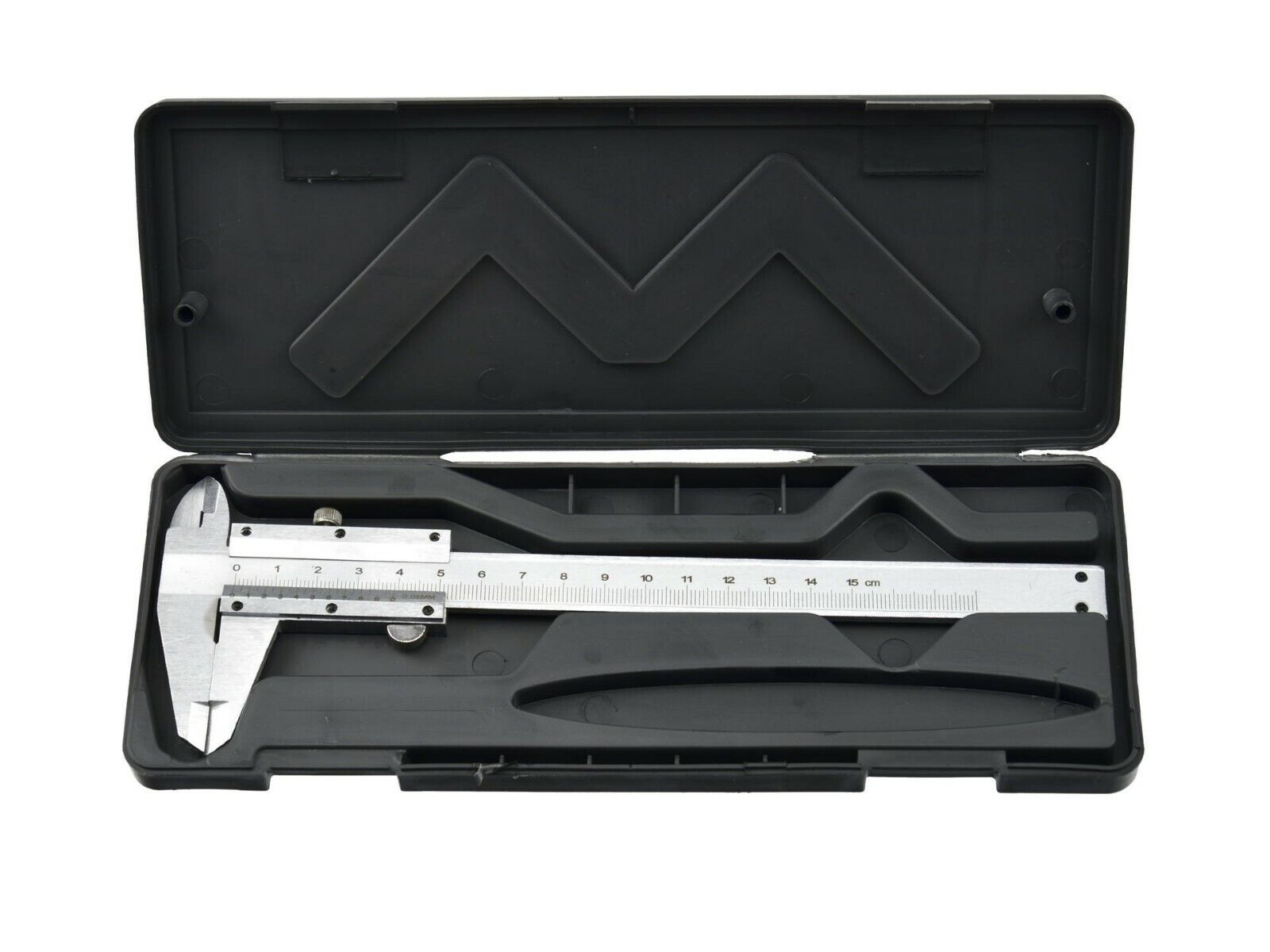Fabricado en acero al carbono, resolución de 0 – 150 x 0,02 mm. Cuatro tipos de medición; interna, externa, profundidad y escala. Incluye maletín para almacenaje.