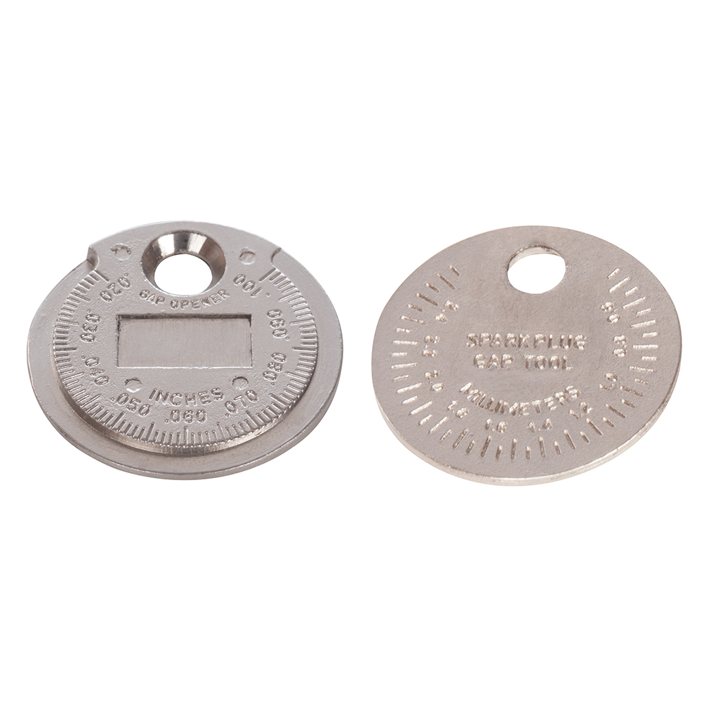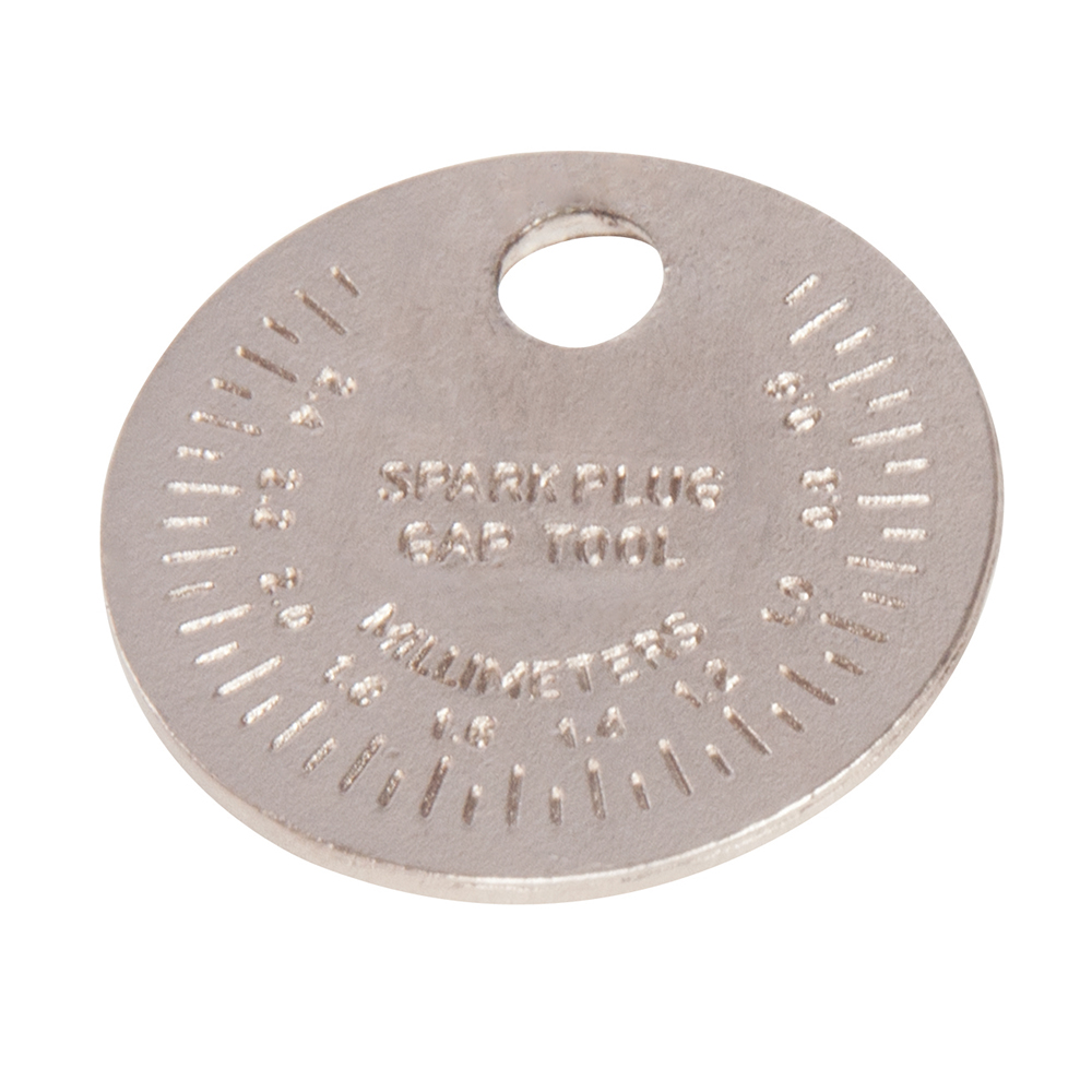 Galga para bujías con agujero para ajustar la distancia de los electrodos sin dañarlos. Graduaciones para determinar la distancia entre los electrodos a lo largo del borde exterior. Métricas: 0,5 a 2,55 mm, Imperial: 0,02 a 0,1 pulgadas. Aleación de acero.