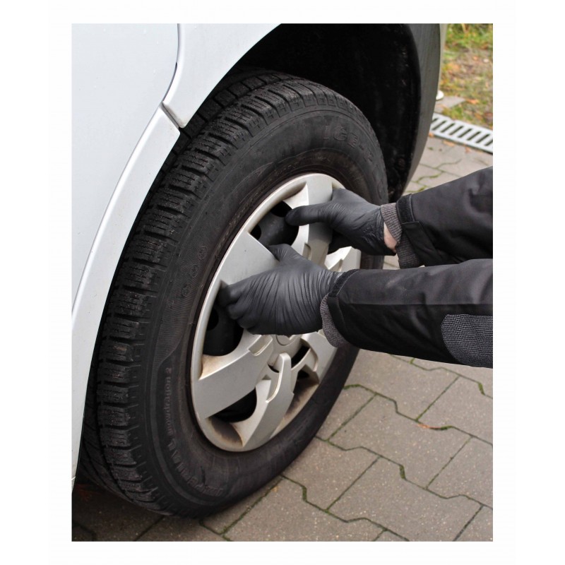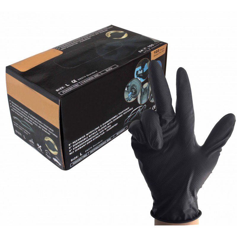 Clasificación CE: equipo de protección personal Estándar: EN374 Material: nitrilo negro longitud: ±240mm Talla L (9-10) Paquete: 100 piezas