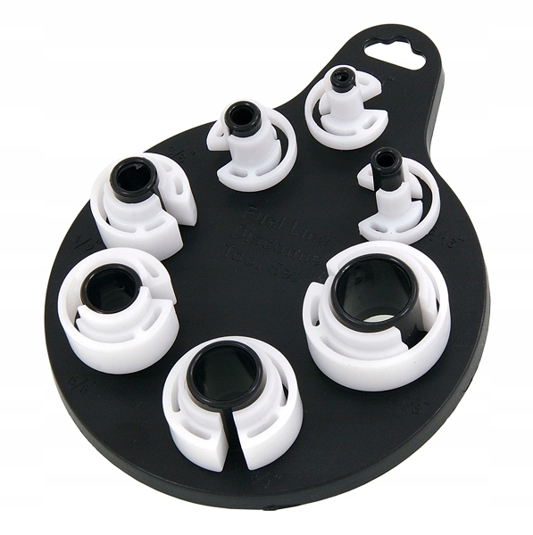 – Juego de 7 herramientas de diferentes medidas para la desconexión rápida de mangueras de aire acondicionado de vehículos y mangueras de combustible que llevan conectores rápidos. El adaptador se ajusta al tamaño de la manguera y empuja la unión entre las dos partes facilitando la desconexión.