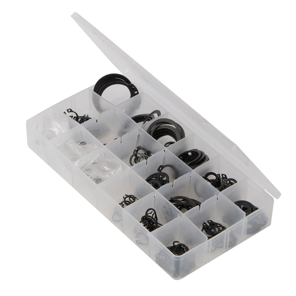 Juego de anillos de retención de acero. Diámetros internos de 6 – 23 mm y externos de 7 – 29 mm.