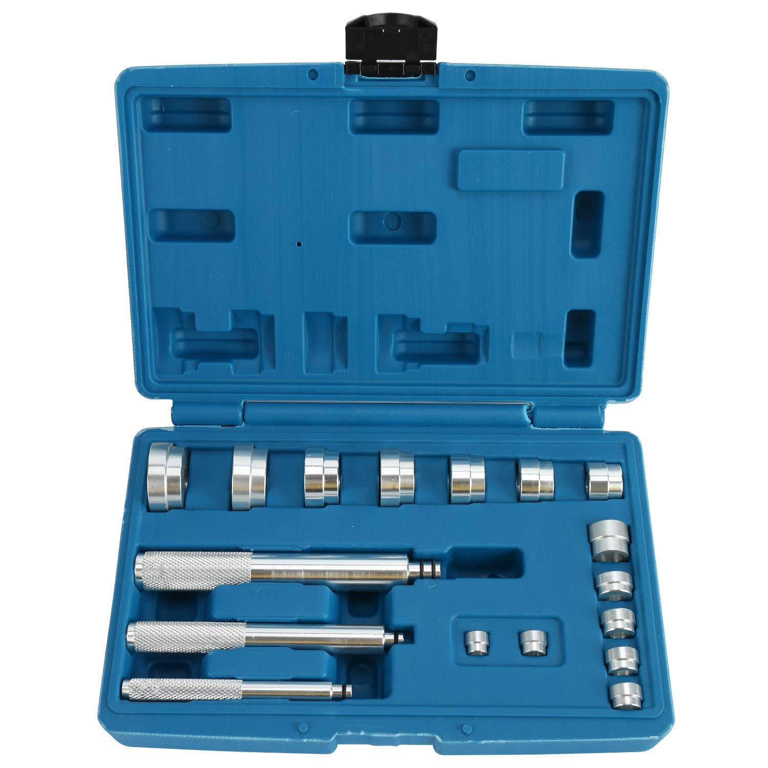 Juego para quitar o instalar rodamientos,bujes y retenes,esta hecho de aluminio para evitar daños en las piezas instaladas, compuesto de :