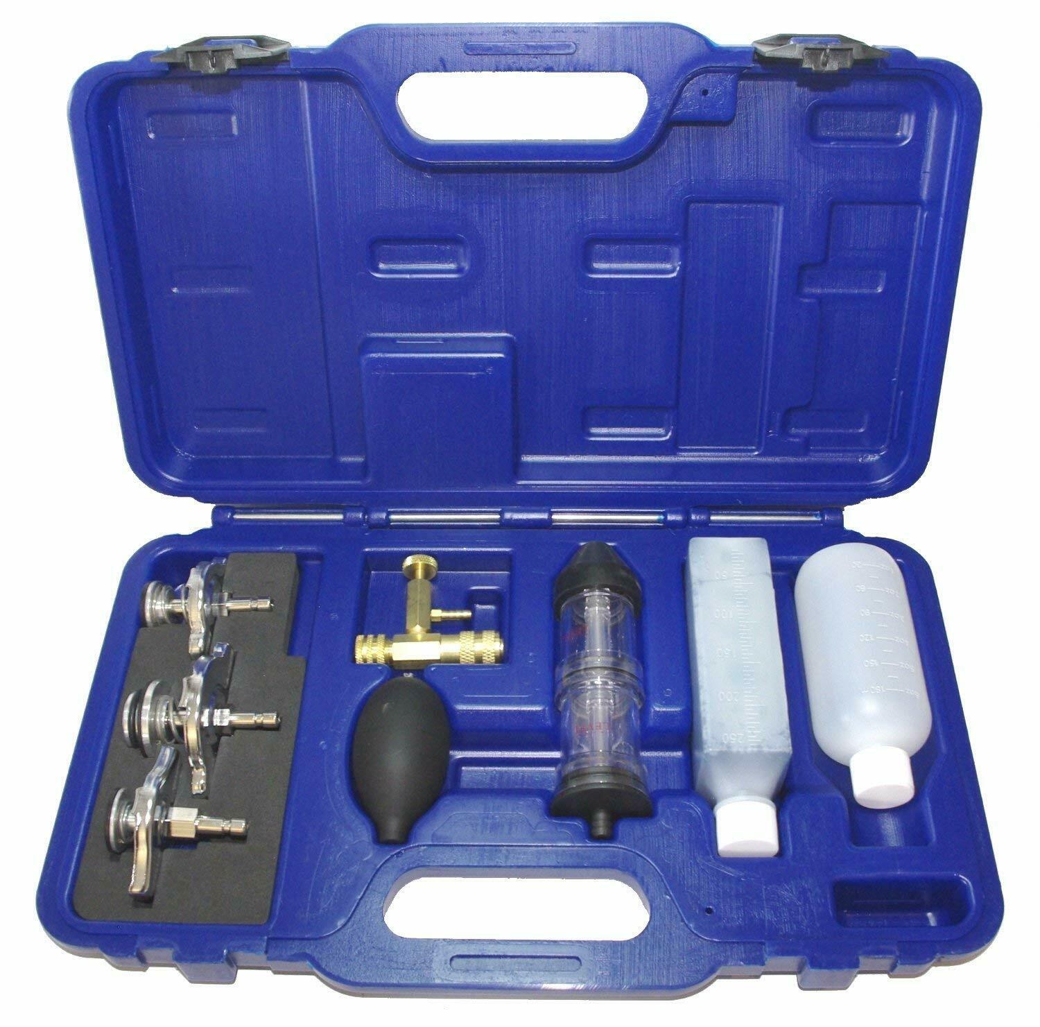 el principio de funcionamiento se basa en la medición del contenido de co2 en el sistema de refrigeración. set: el dispositivo para medir la fuga de la junta de la culata. (tiene dos cámaras separadas por un filtro y una conexión universal a la tapa del radiador)