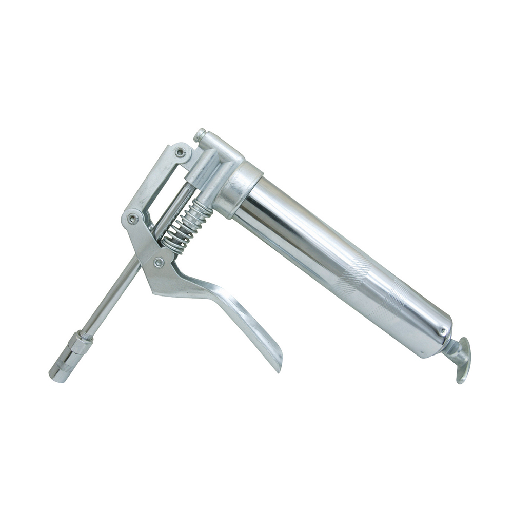 Pistola engrasadora galvanizada. La boquilla se puede colocar en 2 posiciones diferentes. Pistón accionado por resorte y válvula de liberación de aire. Incluye boquilla flexible y rígida. Compatible con cartuchos de grasa de 90 cm3. Presión de trabajo: 3.000 psi/200 bar.