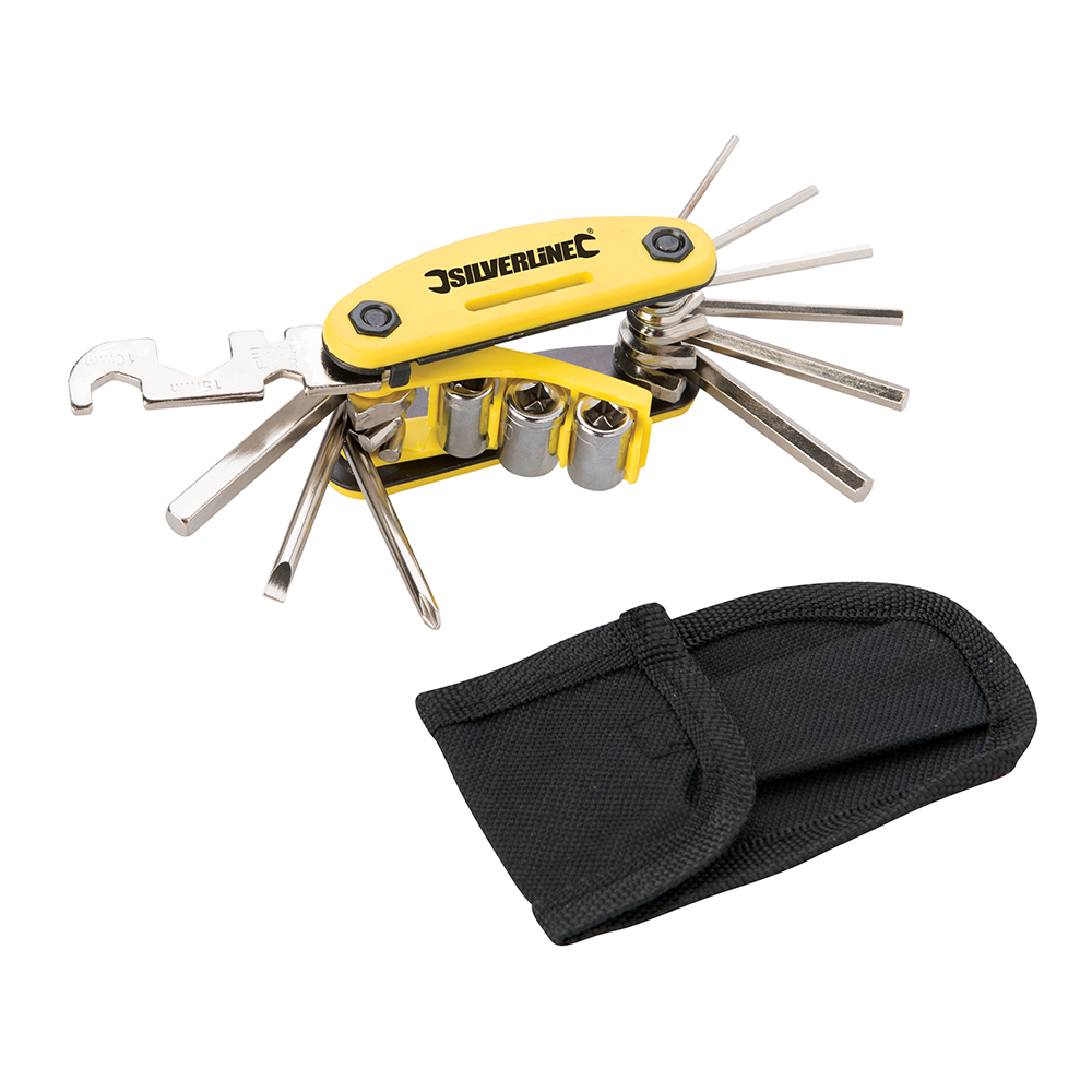 Incluye llaves hexagonales de 2, 2,5, 3, 4, 5 y 6 mm, llaves de 8, 10 y 15 mm, llaves de vaso y vasos de 8, 9, y 10 mm. 1 destornillador plano de 6 mm y 1 destornillador Phillips de 6 mm. Bolsa para almacenaje.