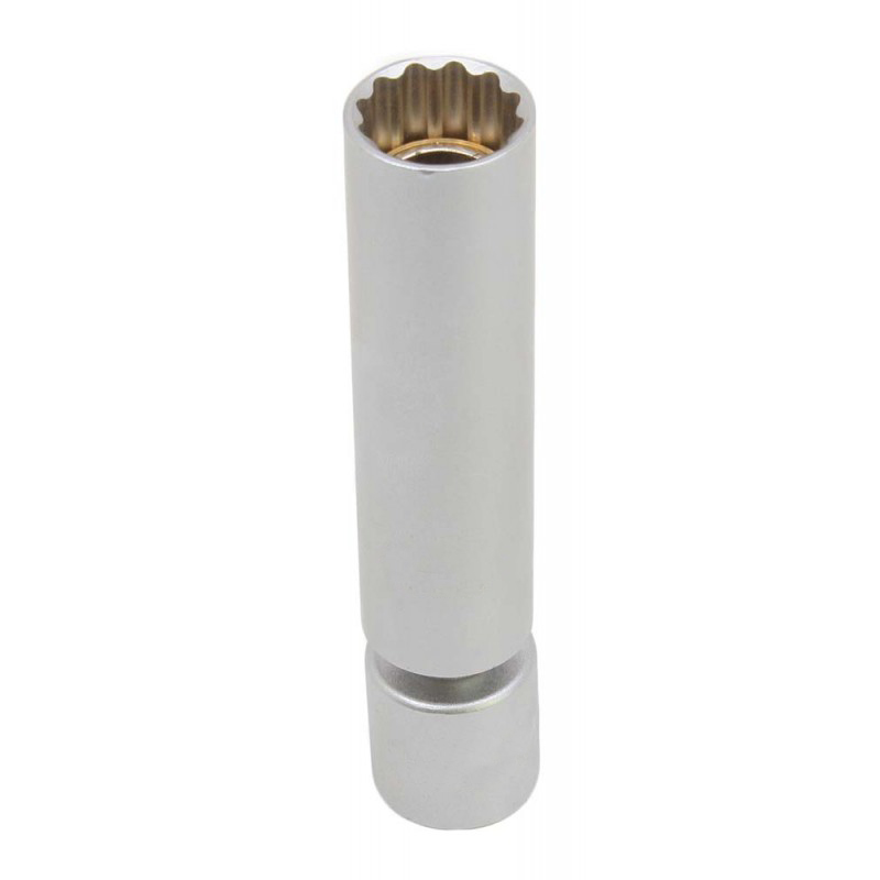 Llave de vaso con articulación para carraca de 3/8″ de 14 mm,de 12 caras y 92 mm de largo permiten su uso con bujías hexagonales y de doce lados en lugares de difícil acceso.